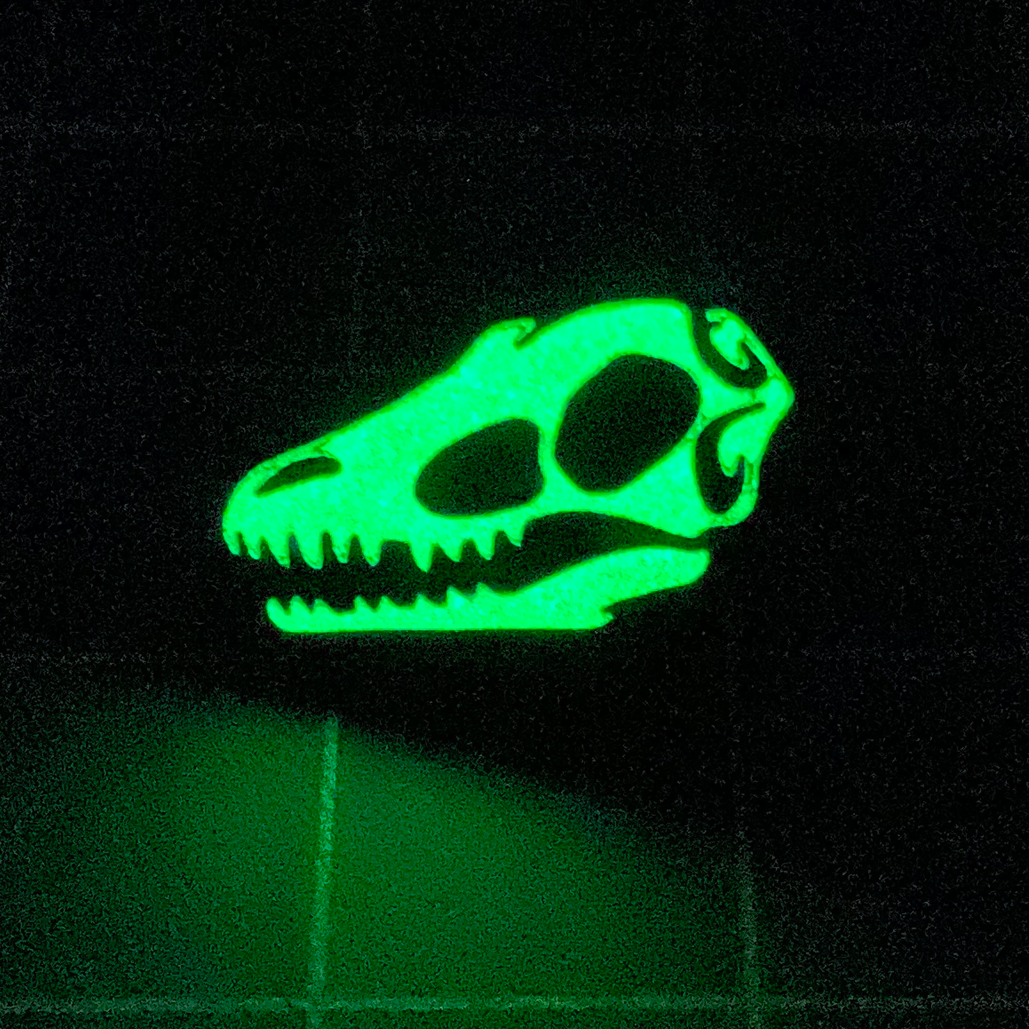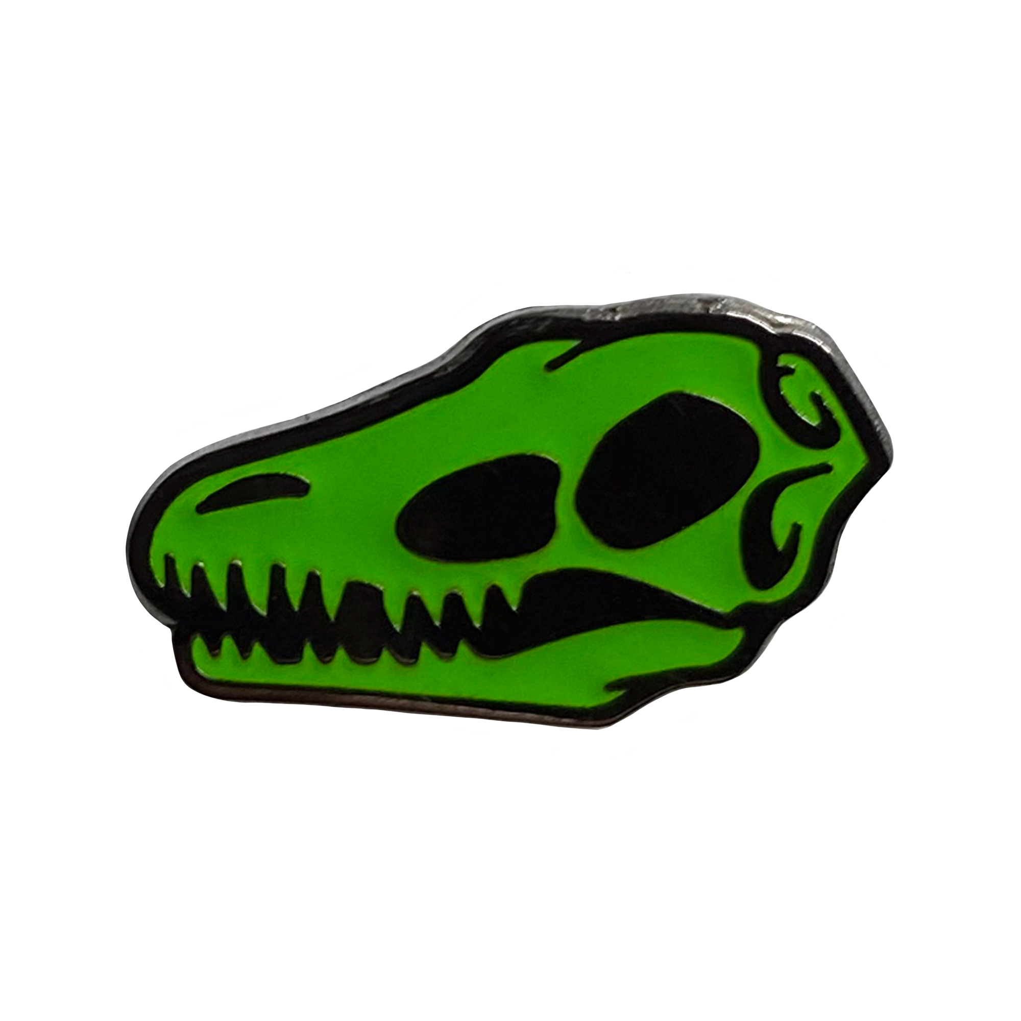 A vibrant glow in the dark green metal enamel pin of a Raptor skull! Perfect gift for any dinosaur lover or pin collector. Pin features black colored metal with soft enamel inlay and is great for decorating back packs, lanyards, jean jackets and more!