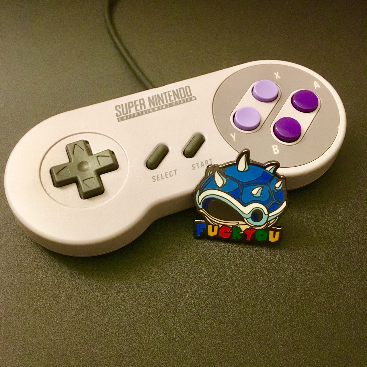 A vibrant metal pin of a Blue Spiked Turtle Shell that proclaims "Fuck You" to first place!! Perfect gift for any game lover or pin collector. Pin features two metal spokes with rubber claps. Is great for decorating back packs, lanyards, jean jackets and more!