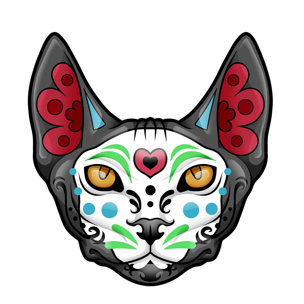 A high quality printed and die cut vinyl sticker of a Sugar Skull inspired Sphynx Cat. Vinyl is indoor and outdoor quality so they are perfect for laptops, automobiles, and more! Great gift for Sphynx and cat lovers.